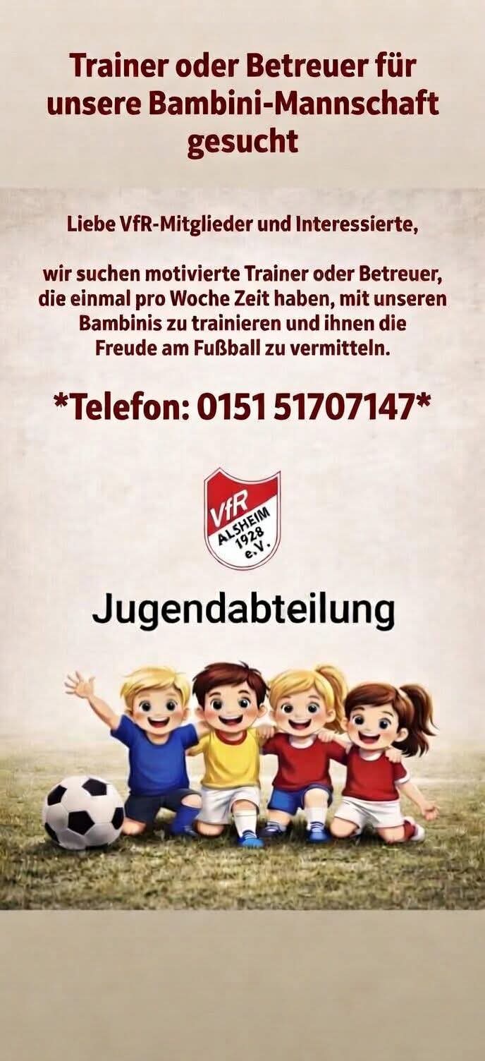 Der VfR Alsheim und der TuS Dorn-Dürkheim laden euch und eure Kinder herzlich zu einem gemeinsamen Schnuppertraining ein 😊 📍 Ort:Rasenplatz Dorn-DürkheimBahnhofstraße 3867585 Dorn-Dürkheim Termine: Dienstag, 07.04.🕔 17:15 – 18:30…